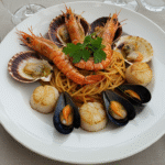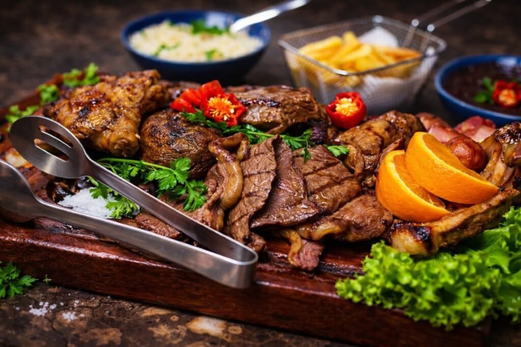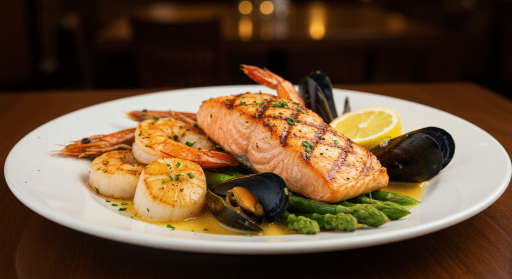 Carnes grelhadas no ponto e mariscos frescos que transformam cada refeição numa experiência memorável.